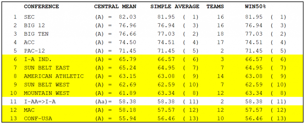 The following are the individual G5 conference rankings highlighted in yellow and the overall rankings within overall ranking in Division I FBS with dedicated divisions in conferences shown separately.