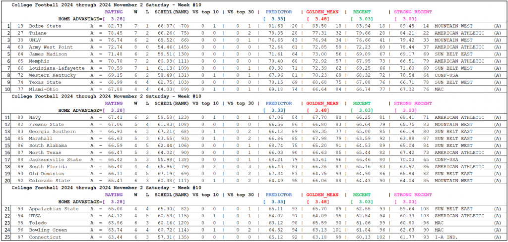 Here are the Top 25 G5 rankings based on the Sagarin rankings for the week ending Nov. 2nd, 2024 following the Week 10 games. We will will have a final ranking after all bowl games and the national championship game in January.