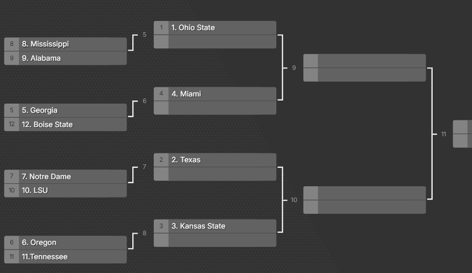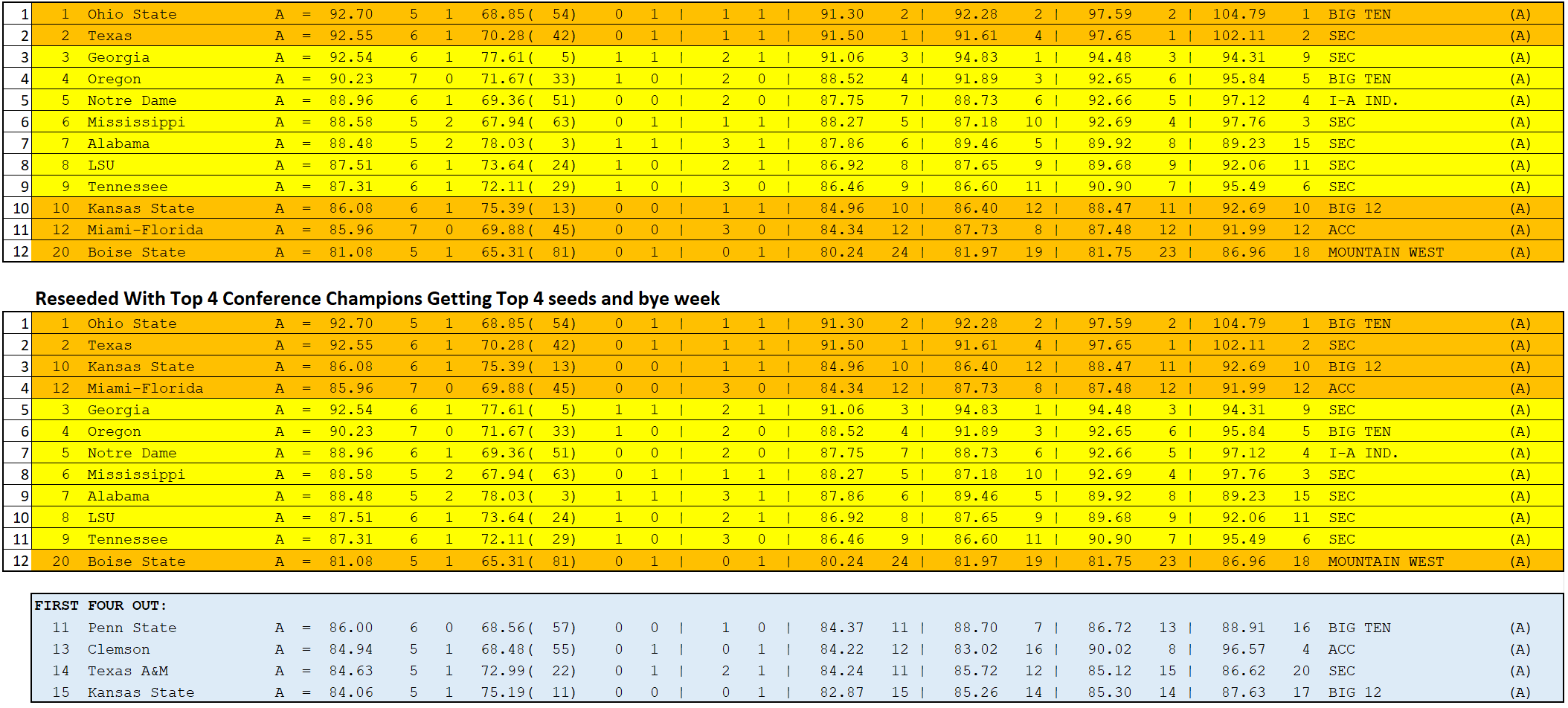 With the reseeded Top 4, here is what the bracket would look if the Sagarin rankings were used based on the season to date through Week 8: