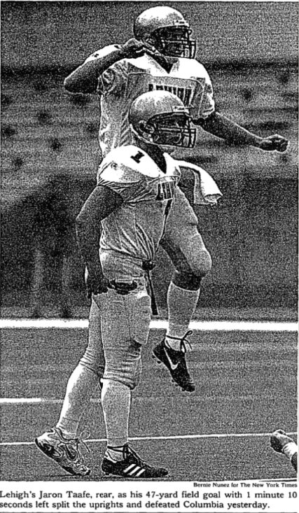 “The Lehigh coach, Kevin Higgins, did not hesitate to send in PK Jaron Taafe rather than try another pass from his crack quarterback, Phil Stambaugh.,” The Times said. ”It’s fourth down,” Higgins said. ”A field goal wins the game. There was no question whatsoever.”