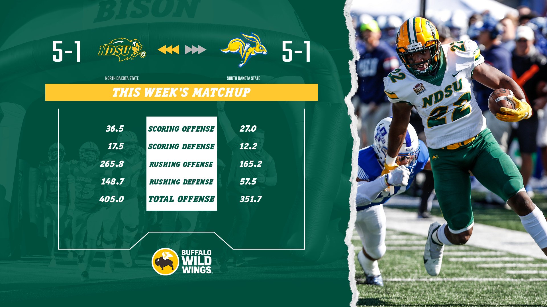 Both teams in this match-up though come in with five wins and an FBS loss. SDSU lost its opener narrowly at Iowa 7-3, while NDSU also narrowly lost its FBS game in Week 3 to Arizona 31-28.